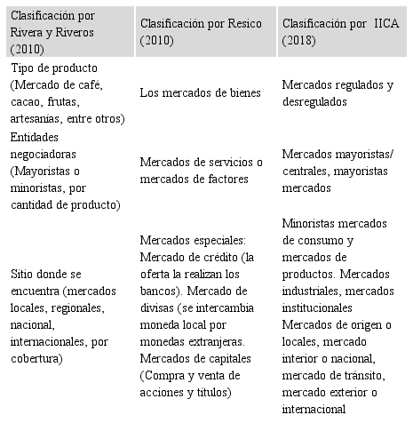 Desde esta perspectiva se distinguen distintos tipos de mercados, como los que se presentan en el Cuadro 2, considerando “el tipo de producto, las entidades que negocian y del sitio donde se encuentra el comprador” (Rivera y Riveros, 2009, p.7) y los “mercados de bienes y servicios” como menciona (Resico, 2010, p.53).