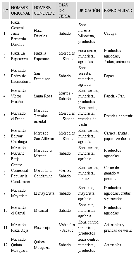 Así, los resultados de la investigación muestran que en la ciudad de Riobamba, existen 12 mercados locales con diferentes especialidades, que se pueden catalogar como mercados minoristas, mercados mayoristas, mercados de productos y mercados de consumo; distribuidos en cuatro zonas (ver Cuadro 3).