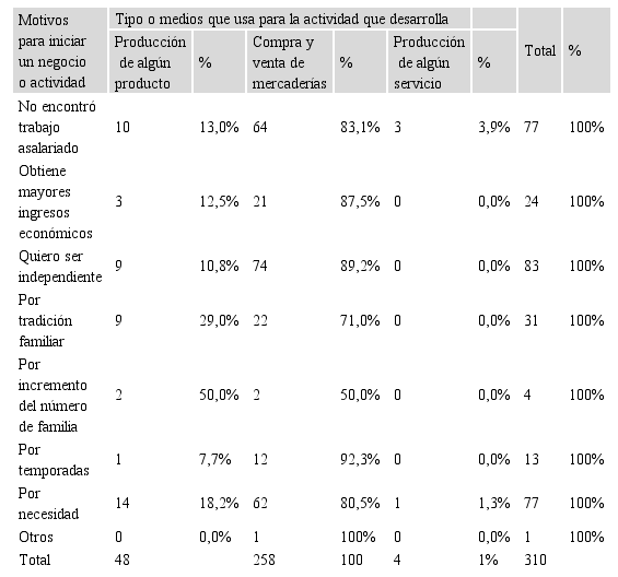 Los resultados del cruce de variables: Motivos y medios que usa, para desarrollar la actividad informal en la tabla de contingencias; muestran que las personas que utilizan como medio para el comercio informal la compra y venta de mercadería, fueron motivados porque no encontró un trabajo asalariado en un 83,1%, necesidad en un 80,5%, porque quiere ser independiente en un 89,2,3%, quiere obtener un mayor ingreso económico en un 87,5%, tradición familiar en un 71%, por temporadas en un 92,3%, por un incremento en el número de familia en un 71%; como se puede observar en la Tabla 5. Esto significa que la disponibilidad de productos para comercializar es un factor importante para iniciar una actividad del comercio informal, seguido de la disponibilidad de productos.