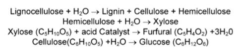 Los materiales de lignocelulosa consisten en tres fracciones químicos primarios o precursores de: a) Hemicelulosa/poliosas, un azúcar-polímero de pentosas predominantemente; b) celulosa, un polímero de glucosa; y c) la lignina, un polímero de fenoles. En ese sentido, la Ecuación general de la conversión de la materia prima lignocelulósica, es la siguiente: