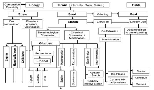 De igual manera, el maíz puede ser convertido en almidón o directamente utilizado después de la molienda a comida, como se observa en la Figura II. El procesamiento adicional puede llevarse a cabo en cuatro direcciones: a) Fraccionamiento, b) plastificación, c) modificación química, o d) la conversión biotecnológica a través de la glucosa. La comida, puede ser tratada y terminada por extrusión en aglutinantes, adhesivos y de relleno. El almidón, se puede acabar por medio de plastificación (co- y mezclar polimerización, la composición con otros polímeros); modificación química (eterificación en carboxi-metil almidón; división de aminación reductora en etileno diamina; esterificación y re-esterificación en ésteres de ácidos grasos a través de almidón acético, la división hidrogenante en sorbitol, etilenglicol, propilenglicol, glicerina); y, la conversión biotecnológica a poli-3-hidroxibutírico.