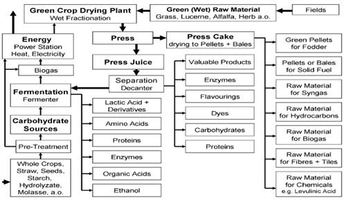 Así, las plantas verdes representan una fábrica química natural y planta de alimentos. La tecnología de fraccionamiento húmedo cuidado, se utiliza como primera etapa (refinería primaria), para aislar el contenido de sustancias en su forma natural. Por lo tanto, los productos de cultivo verde (o bienes de residuos orgánicos húmedos) se separan en una torta rica en fibra de prensa y un jugo verde rico en nutrientes. Al lado de la celulosa y el almidón, la torta de prensa contiene colorantes valiosos y pigmentos, fármacos brutos y otros compuestos orgánicos. El jugo verde contiene proteínas, aminoácidos libres, ácidos orgánicos, colorantes, enzimas, hormonas, otras sustancias orgánicas y minerales.