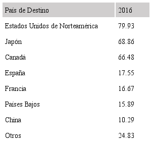 De hecho, México se ha posicionado como el principal productor de aguacate en el mundo, y por tanto, “es el principal proveedor en el mercado internacional, con una aportación del 45,95% del valor de las exportaciones mundiales” (Secretaría de Agricultura, Ganadería, Desarrollo Rural, Pesca y Alimentación [SAGARPA], 2017, p.2), puesto que la superficie sembrada de este fruto ha venido creciendo en los últimos años. En el 2013, por ejemplo, se sembraron 92.417 hectáreas y para el 2019 se tenían sembradas 253.317 hectáreas. México exporta el aguacate a Estados Unidos de Norteamérica(4) (Wonjung, 2018), Japón, Canadá, España, Francia, Países Bajos, El Salvador, China, Honduras y Guatemala, como se observa en la Tabla 1.