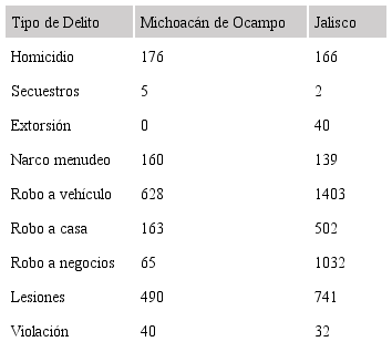 A nivel de entidades federativas, los estados que sobresalen por el número de homicidios dolosos por cada 100 mil habitantes son: Colima (97,20), Baja California (78,00), Chihuahua (75,77), Guerrero (63,42), Guanajuato (58,81), Quintana Roo (47,27), Michoacán (44,24), y Morelos (39,14). En el caso de Jalisco, en el 2018 se tenían registrados 35,37 homicidios por año por cada 100 mil habitantes (Aguirre, 2019). De acuerdo con Semáforo Delictivo, que es un proyecto ciudadano para la paz en México, que publica un índice mensual sobre la incidencia de delitos que se comenten en México, segregado por estado y municipio; Michoacán de Ocampo y Jalisco, presentan los siguientes índices de delitos, así como el número de incidencias, que se aprecian en la Tabla 2.