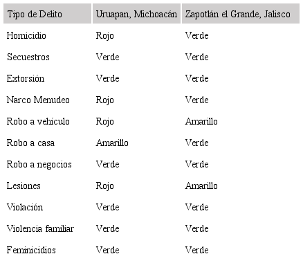 De acuerdo con Semáforo Delictivo para septiembre del 2019, los municipios de Uruapan Michoacán y Zapotlán el Grande, Jalisco, presentaban el siguiente índice de delitos, en función de los colores del semáforo. En este sentido, el color rojo significa peligro, el amarillo alerta y el verde simboliza que está bien.