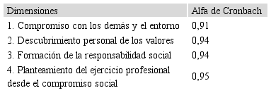 En la Tabla 6, se puede evidenciar el coeficiente de correlación Pearson de las cuatro dimensiones que componen el instrumento. Es posible identificar un alto grado de asociación directa entre las dimensiones, en donde la mayor asociación es presentada por la dimensión cuatro y tres. En cambio, la menor asociación se encuentra en la dimensión uno y tres. Ahora bien, al comparar estos resultados con García, et al. (2016), los mayores valores se concentran en las mismas asociaciones de dimensiones y, en relación a los menores valores difieren considerablemente.