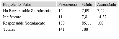 La Tabla 3, muestra la actitud de los estudiantes respecto a su responsabilidad social de manera global, se describe según el porcentaje válido que un 7,09% no son responsables socialmente. No obstante, el 7,80% se manifiesta indiferente; mientras tanto, el 85,11% de los estudiantes encuestados expresa ser responsable socialmente. Esto indica que un porcentaje mayormente significativo tiende a practicar la responsabilidad social en el diario vivir con su entorno. Ahora bien, al comparar éstos resultados con Severino-González, et al. (2019), se puede inferir que los estudiantes universitarios reconocen responsabilidades sociales y, por ende, su comportamiento es considerado socialmente responsable.