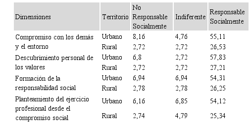 Por otra parte, el grupo de personas que declaran no ser socialmente responsable y que cumplen la condición de territorio rural, el mayor valor se encuentra en la dimensión: Formación de la responsabilidad social (2,78%), en cambio el mismo grupo de personas que cumplen la condición de territorio rural, pero ahora declaran ser socialmente responsable se encuentran en la dimensión: Compromiso con los demás y el entorno (26,53%). Estos resultados son similares a los encontrados por Severino-González, et al. (2019), debido a que los mayores valores son presentados por los estudiantes que declaran provenir de territorios urbanos.