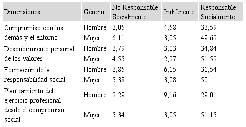 En la Tabla 5, se puede observar por un lado, que la mayor concentración de personas que declaran no ser socialmente responsable y que cumplen la condición de mujer se encuentran en la dimensión: Compromiso con los demás y el entorno (6,11%), en cambio el mismo grupo que cumple la condición de mujer, pero ahora que declara ser socialmente responsable se encuentra en la dimensión: Descubrimiento personal de los valores (51,52%). Por otro lado, las personas que se consideran no ser socialmente responsable y que cumplen la condición de hombre se encuentran en la dimensión: Formación de la responsabilidad social (3,85%), a su vez, los estudiantes varones que declaran ser responsables socialmente, se encuentran en la dimensión: Compromiso con los demás y el entorno (33,59%). Ahora bien, al contrastar estos resultados con Severino-González, et al. (2019), se puede afirmar que ambos hallazgos indican que las mujeres universitarias reconocen poseer mayores responsabilidades sociales.
