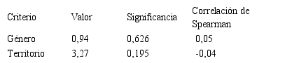 Según los resultados presentados en la Tabla 7, se infiere que la responsabilidad social no depende del género, con nivel de significancia de 0,626 y tampoco depende del territorio de vivienda del estudiante, con nivel de significancia de 0,195. De igual manera, la correlación de Spearman entre responsabilidad social y género es muy débil (0,05), y con territorio es negativa y muy débil (-0,04). Es por ello que, el género y territorio no tienen una asociatividad fuerte para poder señalar que ambos criterios influyen en su valoración.
