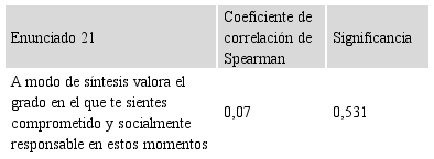 Por otra parte, el instrumento considera un enunciado extra, el cual señala el grado de compromiso socialmente responsable que el estudiante siente en el momento –se comprenden en el instante que se aplica el instrumento-. Los resultados muestran en sus valores una correlación muy débil según género, de acuerdo con el coeficiente de Spearman (0,07). En cuyo caso el valor de significancia es 0,531, lo que permite señalar que no existe diferencia significativa entre ambos grupos (ver Tabla 8).