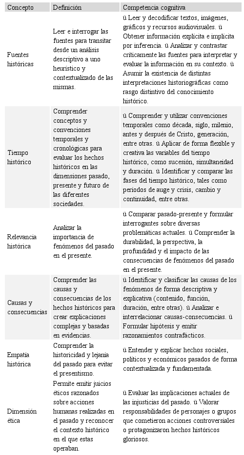 Dentro de los lineamientos necesarios para desarrollar el pensamiento histórico, destaca la simulación del trabajo del historiador en la clase, porque permite articular e interrelacionar los seis conceptos fundamentales de dicho metaconcepto; a saber, estos son: Fuentes históricas, tiempo histórico, relevancia histórica, causas y consecuencias, empatía histórica y dimensión ética (VanSledright, 2014; Sanz, Molero y Rodríguez, 2017; Gómez, Ortuño y Miralles, 2018). En el cuadro 1 se presentan los conceptos citados con una breve definición y las competencias cognitivas que movilizan.