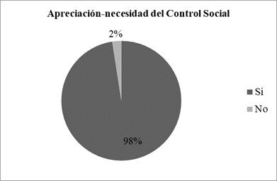 Los hallazgos encontrados en la investigación, también permitieron evidenciar en un 98,43% del total de encuestados, la existencia de desconfianza hacia la administración de los recursos económicos, para el financiamiento del sistema de seguridad social en salud, por parte de actores y líderes intervinientes en el sistema, al considerar como indebida la destinación de los mismos, por lo cual revelan la necesidad de un control social (ver Gráfico I). Asimismo, se muestra la consideración de estos en relación a los procesos administrativos dentro del sistema de salud, por suponer que los mismos se encuentran permeados por la ilegalidad y la corrupción.
