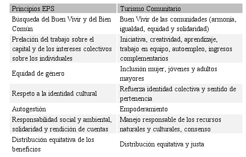 En el Cuadro 1, que se presenta a continuación, se pueden observar los principios que son comunes a la Economía Popular y Solidaria (EPS) y al turismo comunitario. Entre ellos, destacan la promoción de valores en defensa de los intereses colectivos, el enfoque inclusivo, la distribución equitativa, la armonía con la naturaleza y la defensa de la identidad.