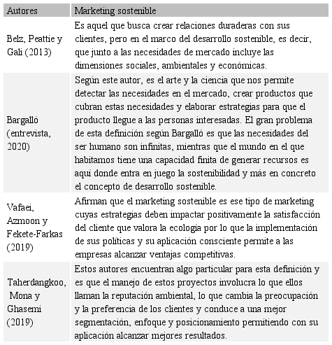 Ahora bien, es de destacar que cuando se habla de marketing, se busca abordar no solo la necesidad del mercado, sino las dimensiones sociales, ambientales y económicas como un todo, así lo refiere León (2013), es necesario concretizar relaciones de intercambio exitosas, tanto para la empresa como para sus clientes y el macro y micro ambiente donde se realizan. Con lo anterior, se manejan los intercambios de valor, primordiales para hablar de marketing sostenible. En ese sentido, se han explorado diferentes definiciones realizadas por varios autores, tal como se observa en el Cuadro 1 de definiciones que se muestra a continuación.
