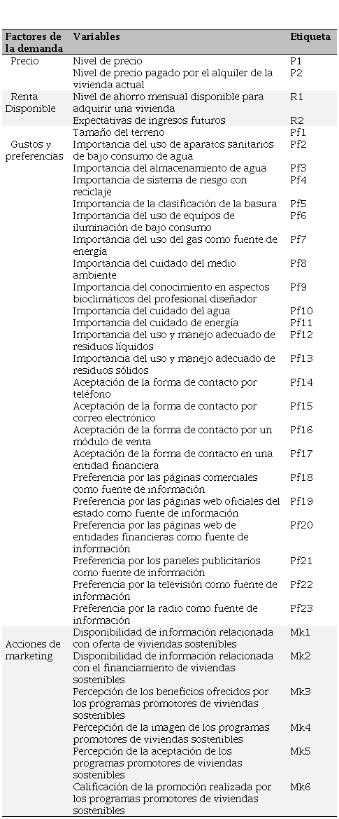 Con el fin de establecer las variables del análisis de los factores que influyen en la demanda de viviendas sostenibles, se tomó como punto de partida aquellos que se definen en la función de la demanda mencionada por Agueda y Mondejar (2013): Cantidad demandada, precio de venta, renta disponible, los gustos y preferencias y las acciones de marketing; de los cuales se consideró no incluir cantidad de viviendas demandadas, debido a que el producto son viviendas y la población en estudio tiene la intención de adquirir una sola vivienda por núcleo familiar.