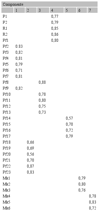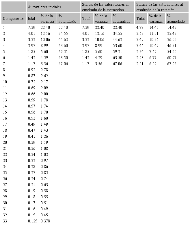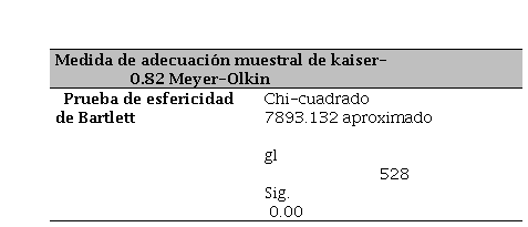 Para establecer la factibilidad de aplicar el análisis factorial, se verificó la adecuación de la muestra con el cálculo del KMO, seguida de la verificación de existencia de intercorrelaciones a través de la prueba de Bartlett. El KMO obtenido es alto (0.82), y el nivel de significancia para la prueba de esfericidad de Bartlett es inferior a 0.05 (Tabla 1), demostrando con ello la factibilidad del análisis, pues el valor de "p" indica si la asociación es estadísticamente significativa y que se percibe como una etiqueta que supone una garantía de calidad; este valor ha sido arbitrariamente seleccionado y se fija en 0.05 ó 0.01, lo que representaría una seguridad del 95% si lleva implícita una p< de 0.05 y una seguridad del 99% si lleva implícita una p< de 0.01.
