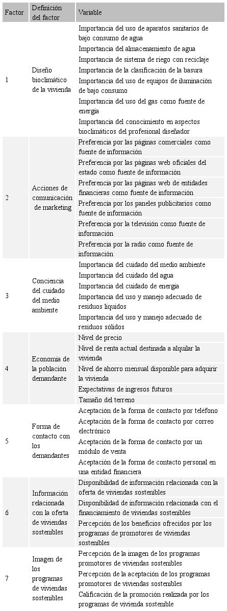 Identificadas las correlaciones asociadas en cada factor y considerando la definición de las variables analizadas, se procedió a definir los factores, tomando en cuenta los establecidos por Agueda y Mondejar (2013), en relación a los factores que influyen en la demanda de viviendas sotenibles, y que agrupan el precio de venta tanto del producto como de los bienes relacionados, los gustos, preferencias, capacidad de renta disponible de los consumidores, y las acciones de marketing, tal como se muestra a continuación en el Cuadro 3.