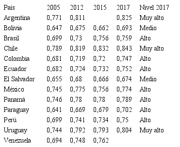 Más actualizado, el informe sobre Desarrollo Humano que presenta el PNUD al 2018 se basa en 189 países, clasificándolos en cuatro grupos: Muy alto, Alto, Medio y Bajo. De los países latinoamericanos analizados, se puede observar en la Tabla 2 que ninguno está en nivel bajo, encontrándose en nivel Muy Alto, Argentina, Chile y Uruguay. Dos países están en nivel medio: Bolivia y El Salvador, el resto de países analizados se encuentra en un nivel alto (Programa Nacional de las Naciones Unidas, 2018).