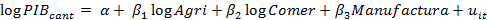 Para el estudio de investigación se estima un modelo de datos de panel que mejor se ajuste a los datos y variables a las que se hace referencia. Para dicho modelo se considera como agentes a los cantones, objetos de estudios, y a las variables: PIB cantonal y los ingresos en el sector agrícola, comercial y manufacturero, aquellos que son las principales actividades económicas que ejercen los cantones de estudio. Cabe destacar, que se analiza la sensibilidad que tiene cada uno de estos sectores en el ingreso total medido por el PIB cantonal. La estimación del modelo se especifica a continuación en la ecuación 4: