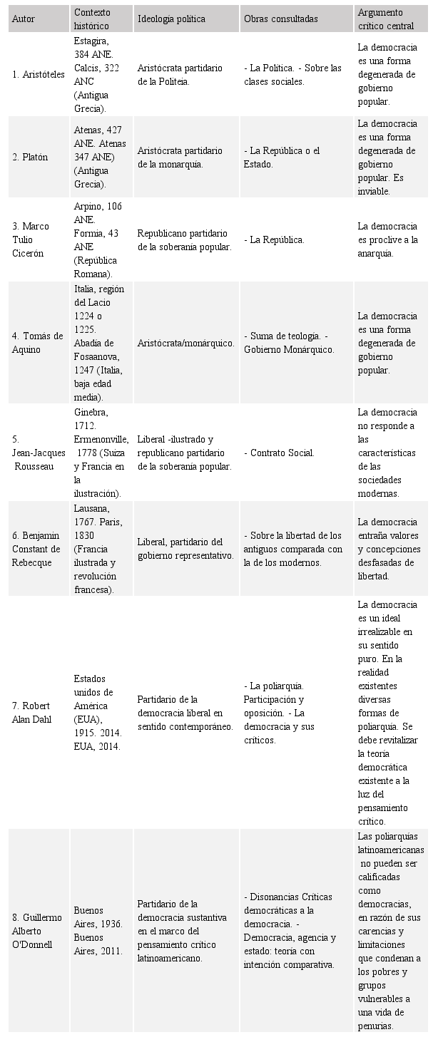 La presente categorización tiene el objeto de simplificar y sistematizar los autores abordados en la investigación, a partir de la síntesis de lo que, al parecer, constituye el núcleo central de sus argumentos críticos contra las poliarquías o el ideal democrático propiamente dicho; argumentos condicionados por las representaciones políticas, ideológicas y epistemológicas de su específico contexto histórico, que se pueden apreciar en el Cuadro 1.