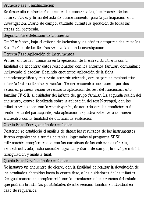 A continuación, se describe el protocolo de diagnóstico del infante, compuesto por cinco fases que muestran la frecuencia de ejecución de los instrumentos y técnicas utilizados, tal como se pueden observar en el Cuadro 1, elaborado por el equipo de investigadores del proyecto antes mencionado.