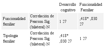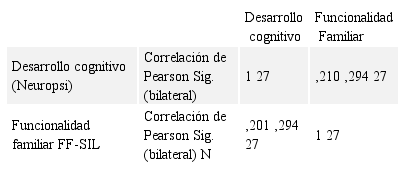 Mediante el análisis bivariado de los datos se relacionó las variables desarrollo cognitivo y funcionalidad familiar. Se determinó en base al Coeficiente de Pearson, una mínima correlación de p=0.210 entre las variables de desarrollo cognitivo y funcionalidad familiar, como se muestra en la Tabla 1.