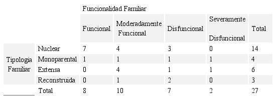 Mediante un análisis de tabulación cruzada, se puede visualizar en la Tabla 2 que las familias de tipología nuclear, cuenta con mayores puntuaciones de funcionalidad y moderadamente funcional, de acuerdo con la clasificación del FF-SIL, seguida por la familia extensa.