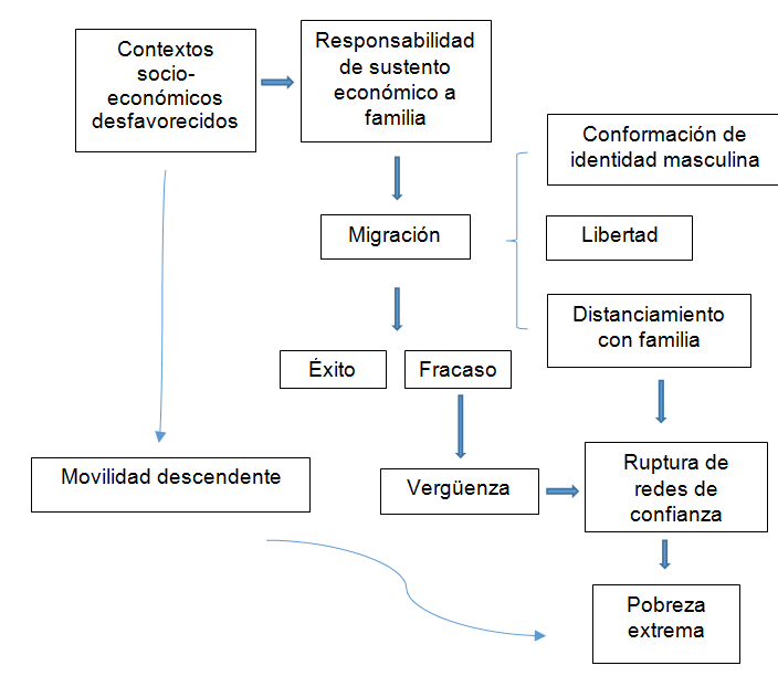 Recapitulando los hallazgos de este estudio en el norte de México (véase Figura I), se considera que hay una relación directa entre la vergüenza de los hombres migrantes, sentida al perder la oportunidad de cruzar al otro lado o a partir del “fracaso” por ser deportados, y la situación de pobreza extrema a la que llegan. Este sentimiento, les impide simbólicamente regresar a su comunidad de origen y pedir ayuda, años o décadas después de haberse ido.
