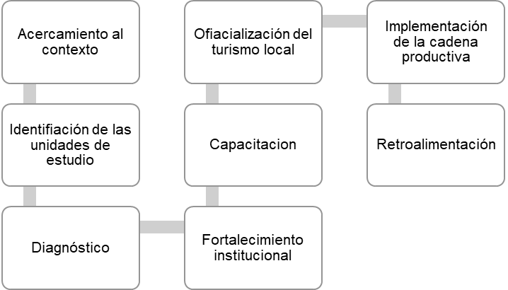 Con base en la Figura anterior, se destaca que la propuesta logística para el aprovechamiento del potencial turístico del municipio Santo Tomás-Atlántico, se desarrolla con un primer paso que se direcciona hacia el acercamiento, el cual implica los primeros reconocimientos del entorno, con el fin de comenzar a definir las áreas de trabajo. Seguidamente, se definen las unidades de estudio que serán medidas en el diagnóstico, proceso que implica los siguientes elementos: a) Dimensión económica, b) desde la dimensión institucional, c) con respecto a la dimensión social, y d) en cuanto a la dimensión física. Por medio del proceso diagnóstico, se pasan a las siguientes fases que se vinculan hacia: