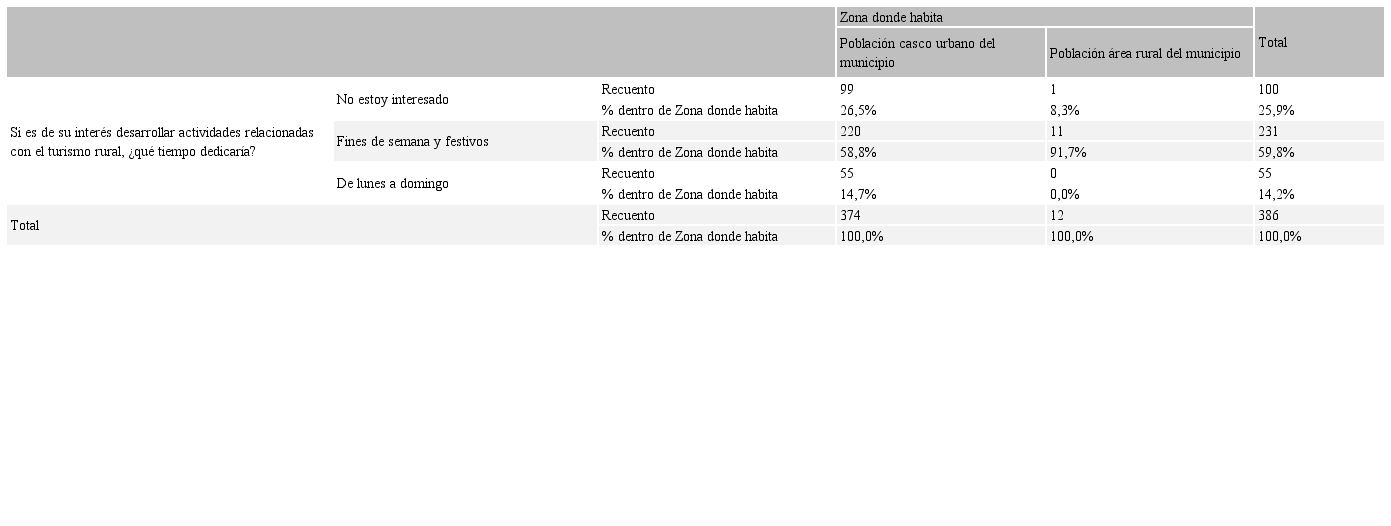 En relación con el interés de la población en participar del ejercicio de la actividad turística en el municipio, de acuerdo con el lugar de asentamiento, se destaca en la Tabla 10, la intención de los habitantes de la zona de dedicar tiempo a realizar actividades ligadas a la promoción de turismo en tiempo parcial, fines de semana y festivos (91,7%), razonable al considera que durante la semana ocuparían su tiempo a las actividades propias del campo.