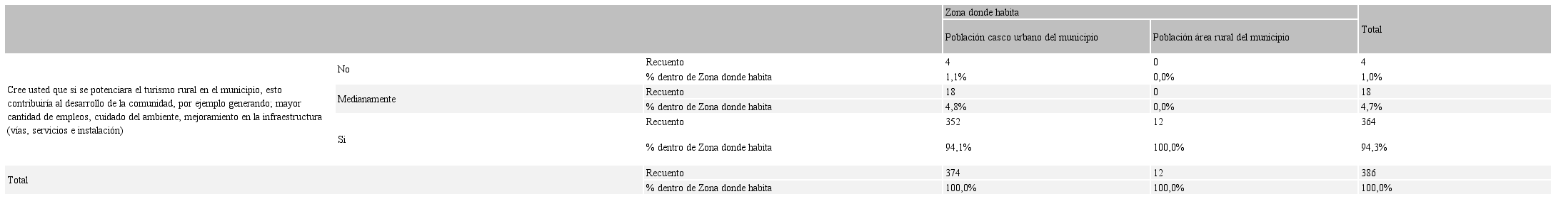 En cuanto al potencial del turismo rural como alternativa de desarrollo local del municipio, se reconfirma, en la Tabla 11, el interés y percepción de la población rural frente a las oportunidades del ejercicio del turismo rural como alternativa de desarrollo del municipio (100%); asimismo, el casco urbano tiene una gran aceptación frente a la apuesta de este tipo de actividades turísticas y su contribución a la mejora de vida de sus habitantes (94,1%).