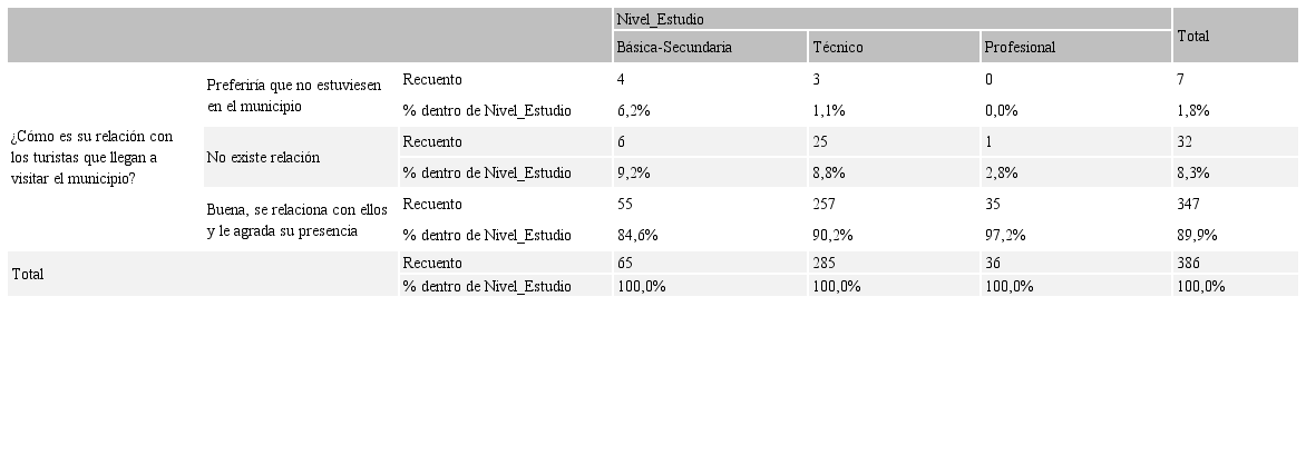 De la misma manera, se refleja en la Tabla 1 que, los pobladores con mejor nivel de estudios (Profesionales 0,0%; Técnico 1,1%) no comparten la posibilidad que no estuviesen turistas en su territorio. Resulta entonces valido afirmar en esta investigación, que entre mayor sea el nivel de formación y conocimiento entre los pobladores, mayor su capacidad de aceptación y relacionamiento con turistas.