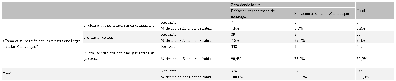 En equivalencia con el análisis anterior, en la Tabla 3 la población ya sea de zona rural (75%) o del casco urbano (90,4%), manifiestan relacionarse bien con los turistas. Frente a la posición de no querer relacionarse, llama la atención que esta condición solo se presenta en habitantes del casco urbano (1,9%), para aquellos quienes habitan en el campo y zonas campestres no muestran indicios de no querer relacionarse con ellos (0,0); situación que evidencia su interés en que las actividades de turismo rural puedan desarrollarse. Asimismo, al contrastar el recuento de datos de la Tabla 1 y 3, permite inferir que el nivel de formación de la población rural le proporciona elementos suficientes para tener mayor receptividad frente a los resultados que podría generar un buen relacionamiento con los turistas interesados en los atractivos rurales.
