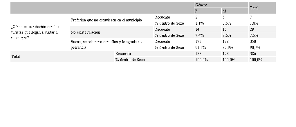 Al considerar si existe alguna correspondencia entre el género de la población y su relacionamiento con los turistas, puede concluir en la Tabla 4, que no existe distinciones en cuanto al género sobre la buena relación con los turistas (femeninas 91,5%; masculinos 89,9%). Por otra parte, se observa una leve tendencia en el género masculino en manifestar preferir no relacionarse con turistas (2,5%) frente a las mujeres (1,1%).