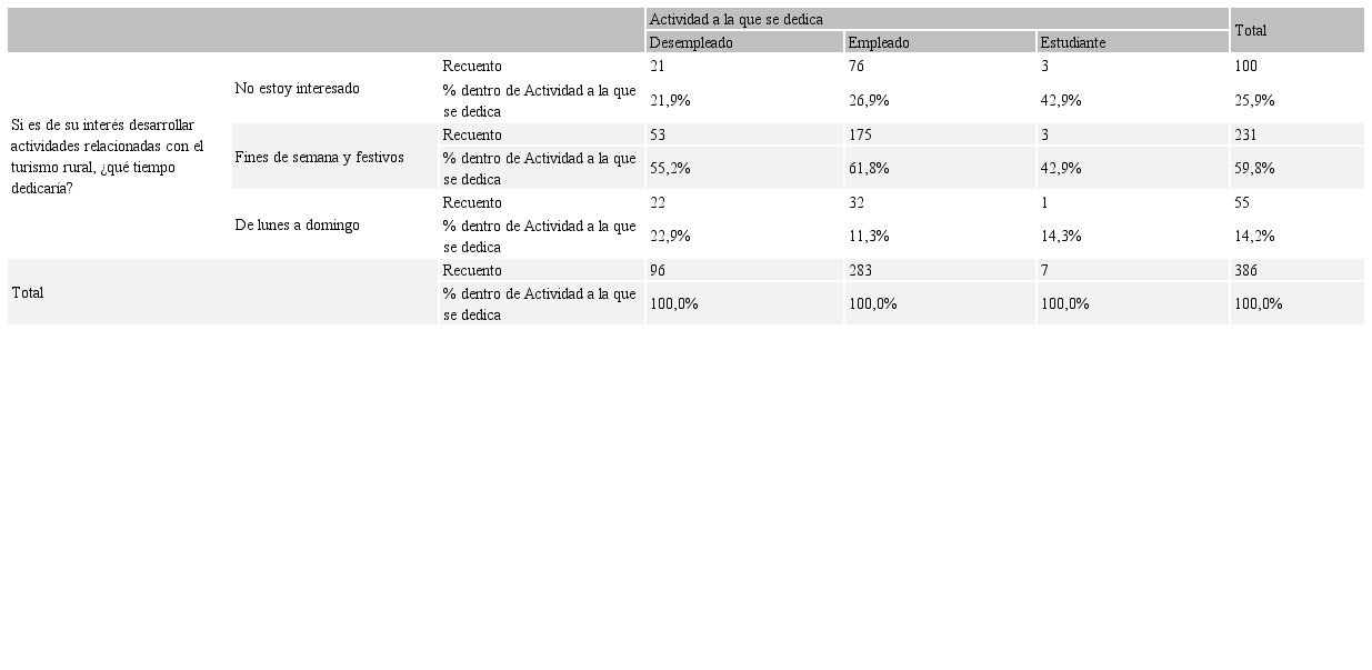 Un representativo porcentaje de población, estaría interesado en desarrollar actividades relacionadas con la promoción del turismo rural, solo fines de semana y días festivos (59,8%) y de ellos se encuentra gran participación tanto de personas empleadas (61,8%), como es de suponer para las personas que no cuentan con un empleo formal, quienes ven esta actividad como una alternativa de generación de ingresos (55,2%), asimismo los que realizan actividades de forma independiente (42,9%), como se evidencia en la Tabla 6. Dedicación completa en la semana de lunes a domingo (14,2%), se ve orientada principalmente para aquellos pobladores que actualmente no cuentan con un empleo (22,9%). Llama la atención de igual forma, que existe un porcentaje representativo (25,9%) de la población, que realmente no estaría interesado en ejercer actividades turísticas.