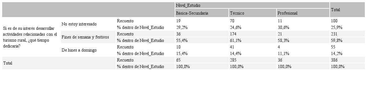 Tal como se aprecia en la Tabla 8, el 74% de la población indistintamente del nivel de estudio, dedicaría tiempo parcial (59,8%) o completo (14,2%) durante la semana a actividades relacionadas con el turismo rural en el municipio. Con dedicación parcial, profesionales (58,3%), técnicos (61,1%) y para quienes cuenta con formación básica o secundaría (55,4%). Con relación a dedicación completa, se tendría disposición en profesionales (14,2%), técnicos (11,1%) y de educación primaria o bachilleres (15,4%).
