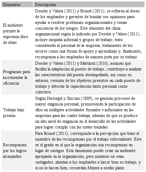 Así, Pacheco, et al. (2020) han considerado que, al analizar y realizar diagnósticos preliminares sobre el clima, las organizaciones pueden iniciar y hacer cumplir cambios que indiquen elementos específicos a los administradores que guían su intervención. De igual forma, explican los autores que el clima organizacional es relevante porque la organización lo evaluará para seguir su desarrollo y predecir cuestiones relacionadas con la percepción del entorno empresarial. A continuación, en el Cuadro 2 se evidencian los elementos del clima organizacional.