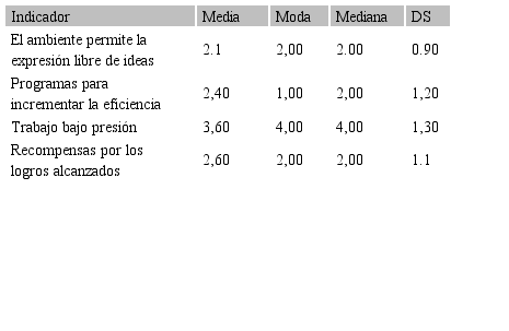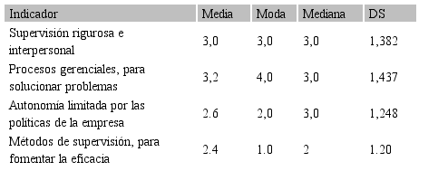 Con respecto al estilo de liderazgo, en la Tabla 1 se evidencia una marcada tendencia a la poca aplicación de herramientas estratégicas para estructurar las operaciones en función de unificar los equipos de trabajo, promoviendo una supervisión rigurosa e interpersonal, dado que el promedio se ubicó en la categoría medio con un rango de 3, y la desviación estándar se ubicó en 1,382; destacando una dispersión de rango medio respecto al indicador analizado, generando como consecuencia que las actividades se vean afectadas por las presiones ejercidas. A este respecto, Parra, et al. (2018) mencionaron que algunas empresas dan importancia a la producción, pero no consideraron la retroalimentación de la comunicación y la distancia entre el subordinado y el superior.