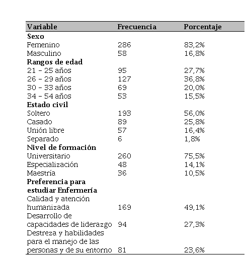 Como se mencionó anteriormente, se incluyó 344 egresados, con un rango entre 21 a 54 años. El 36,8% se encontraban entre 26 y 29 años, el 83,2% de los participantes fueron mujeres, 56,0% solteros, 75,5% con formación de pregrado, así como el 49,1% al elegir su carrera lo hizo porque pensaba que Enfermería brinda calidad y atención humanizada (ver Tabla 1).
