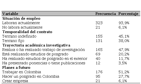 Los egresados con relación a su condición laboral, evidenciaron que el 93,9% se encontraban laborando, tal como se puede apreciar en la Tabla 2; asimismo, el 45,1% respondió que el tipo de contratación fue término indefinido; de igual manera, el 47,9% han realizado investigación y el 51,2% hacia el futuro, esperan seguir trabajando en el País.