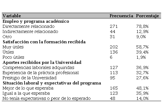 En relación con la coherencia entre las actividades realizadas en su empleo y lo aprendido en el programa académico, el 78,9% expresaron que estaban directamente relacionado. Respecto al aporte recibido por la Universidad, el 36,9% están satisfechos con las competencias laborales adquiridas, así como en cuanto a las expectativas planteadas al iniciar, el 48,1% expresaron que fueron mejores de lo que ellos esperaban (ver Tabla 3).