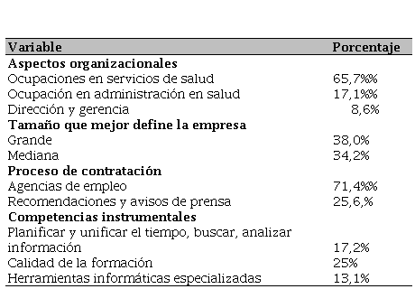 Con respecto al aspecto organizacional, el 65,7% son empresas de servicios en salud, mientras que 17,1% son de ocupación en administración en salud. Se puede afirmar, que los egresados se encuentran laborando esencialmente en empresas de tamaño grande (es decir, con más de 200 empleados, en un 65,8%). Asimismo, en los procesos de contratación se destacan: Agencias de empleo, con un 71,4%; además, se identifica una brecha de cumplimiento positiva que refleja la satisfacción que tienen los empleadores en la competencia de “Crear, investigar y adoptar tecnología” (ver Tabla IV).