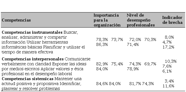 Con respecto a las competencias instrumentales, se encontró que la brecha más amplia entre lo que los empleadores requieren y lo que los graduados ofrecen es en planificar, utilizar el tiempo de manera efectiva, de tal forma que se logren los objetivos, seguida de “buscar, analizar, administrar, compartir información”. Este tipo de competencias se pueden desarrollar con cursos de actualización en habilidades gerenciales o también competencias informacionales.