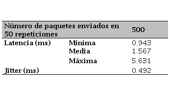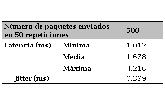 Obteniendo el 100% de los paquetes llegado a su destino, la latencia que existe (parámetro RTT) es la que se observa en el recuadro verde en la Figura VI, siendo de izquierda a derecha, Latencia: Mínima, media y máxima; y Jitter, sus valores, dados en milisegundos, corresponden en el mismo orden después del signo igual.