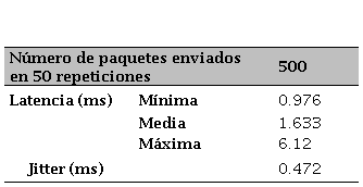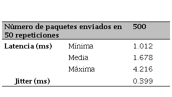 En el Cuadro 10, se muestran los resultados promedios de las pruebas realizadas, dónde 500 paquetes fueron enviados y recibidos, sin pérdida alguna, así como en cada prueba se tomó un valor estimado de 499.668 segundos, 200 bytes transmitido en cada paquete.