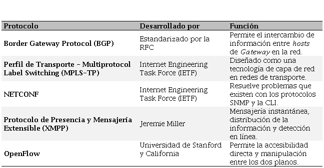 En el Cuadro 3, se indican los protocolos, algunos de ellos ya existentes, con cada uno de sus fabricantes o desarrolladores, y qué funciones realizan cada uno, con el objetivo de determinar cuál es el que mejor se adapta a las necesidades para la implementación de la red RDS. En el mercado, ya se han desarrollado equipos basados en OpenFlow, que representa el protocolo predominante para éstas redes, aunque se están diseñando arquitecturas utilizando otros métodos de comunicación, tales como los protocolos: BGP (Protocolo de puerta de enlace de frontera), MPLS-TP (Conutación de etiquetas multiprotocolo: El perfil de transporte), NETCONF (Protocolo de configuración de red), XMPP (Protocolo extensible de mensajería y comunicación de presencia), entre otros.