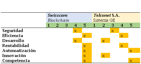 La comparación técnica fue realizada entre dos empresas, diferenciadas por su forma de manejar datos, siendo Swisscom, la organización que emplea Blockchain para el manejo de datos administrativos; y Telconet S.A., que emplea un sistema de gestión de información convencional, tal como se puede apreciar en el Cuadro 4.