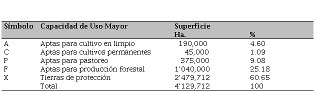 La superficie agropecuaria y forestal, según la capacidad de uso mayor, registrada por la Oficina Nacional de Evaluación de Recursos Naturales (ONERN, 1981), ha permitido tener criterios para establecer y presentar una sinopsis de las clases de tierras existentes, tal como se aprecia en la Tabla 1.