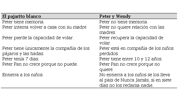Peter Pan and Wendy, supone, además, el texto que quedó en el imaginario popular como «Peter Pan» y en el que se fundamentan mayormente las innumerables adaptaciones literarias, teatrales, musicales y fílmicas, que se han realizado a lo largo del siglo XX y entrado el XXI. Aquí, Peter también es un ser en cuya existencia sólo se cree en la infancia, retomándose la idea que se había presentado en The Little White Bird de él como protector y compañía de los niños en su pasaje a la muerte (Pérez, 2014); si bien la evolución del personaje es notable (Muñoz, 2008), tal y como se observa en el Cuadro 1.